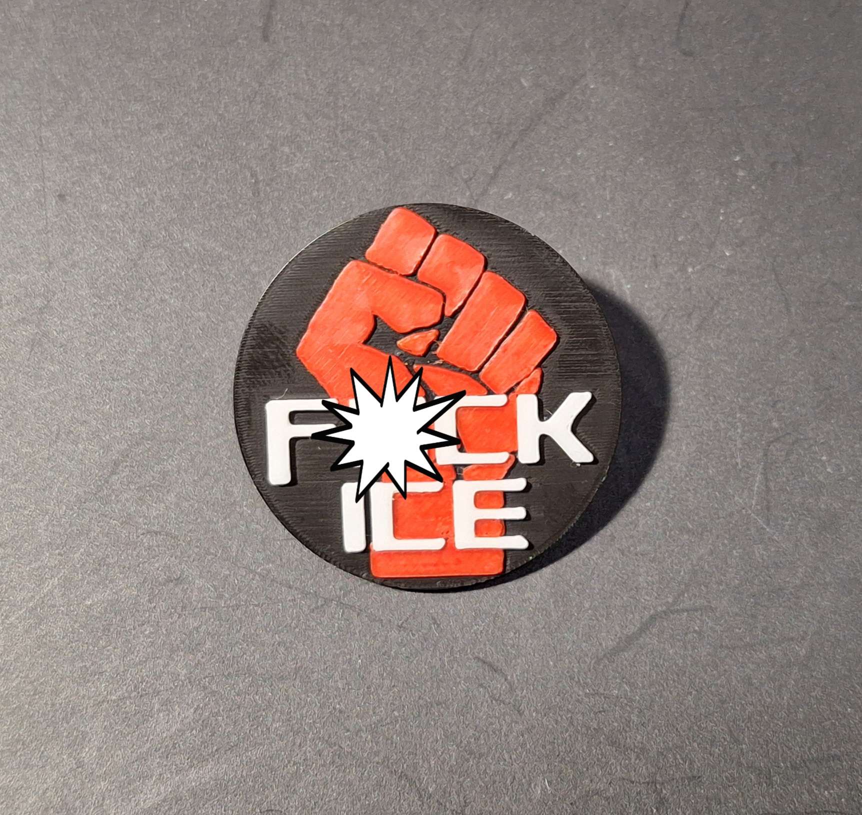 A bold statement of resistance, this pin features stark white lettering over a black background, with a red raised-fist symbol of solidarity behind it. Designed to stand out on jackets, bags, or vests, it’s a clear expression of opposition to injustice and support for immigrant rights.